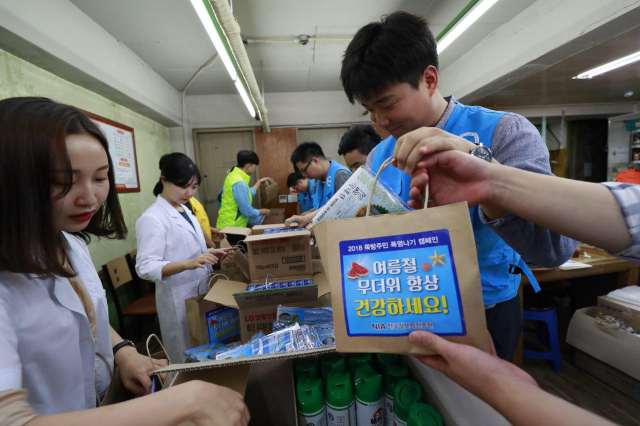 한국정보화진흥원(원장 문용식)은 1일 대구의 쪽방촌을 찾아 건강관리 안내와 여름나기 물품을 전달했다. 이날 봉사 활동에는 신용보증기금과 한국교육학술정보원 등 혁신도시 공공기관 직원과 대구시 관계자들이 참여했다.