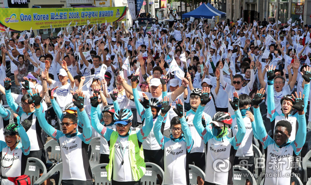 한반도 평화통일과 세계평화를 염원하며 자전거로 국토를 종주하는 '원 코리아 피스 로드 2018 통일대장정' 대구행사가 19일 동성로에서 열렸다.