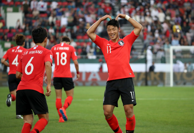 22일 오후(현지시간) 아랍에미리트 두바이 라시드 스타디움에서 열린 2019 아시아축구연맹(AFC) 아시안컵 한국과 바레인의 16강전에서 황희찬이 선제골을 넣은 뒤 세리머니를 하고 있다. 연합뉴스