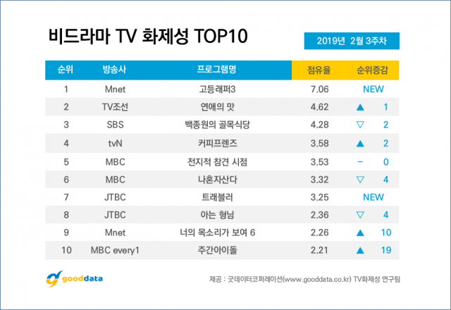 1년 만에 시즌 3로 돌아온 Mnet <고등래퍼 3>가 비드라마 1위를 기록했다. 현란한 랩 실력으로 3학년 A조 1위를 차지한 양승호가 화제되며 출연자 화제성 9위로 진입했다. 2위는 김종민, 황미나 커플의 결별 소식을 전하며 종영한 TV조선 <연애의 맛>이었다. 황미나와 김종민은 각각 출연자 화제성 2위, 4위에 이름을 올렸다.