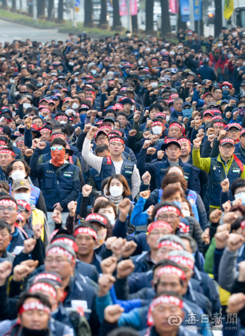 6일 오후 대구 동대구로 더불어민주당 대구시당 앞에서 민주노총 조합원 2천여 명이 '민주노총 대구지역 총파업 대회'를 열고 있다. 이들은 노동법 개악 저지와 비정규직 철폐 등을 정부에 촉구했다.