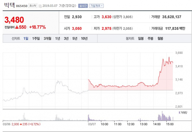 빅텍은 전일 대비 18.77% 상승한 3천380원에 장을 마감했다.