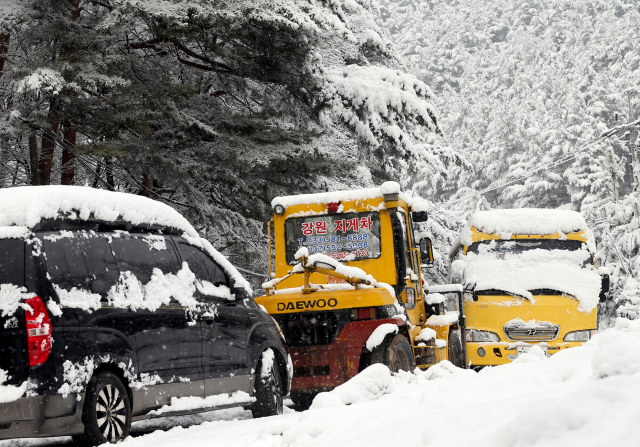 대설주의보 속에 내린 많은 눈으로 7일 오전 강원 인제와 고성을 잇는 미시령에 한겨울 풍경이 연출되고 있다. 연합뉴스