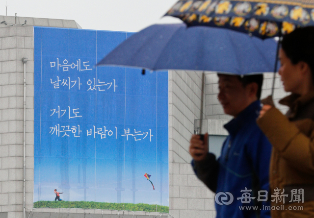 미세먼지를 씻겨주는 봄비가 내린 10일 대구문화예술회관 외벽에 걸린 '희망메시지' 앞으로 우산을 쓴 시민이 산책하고 있다.