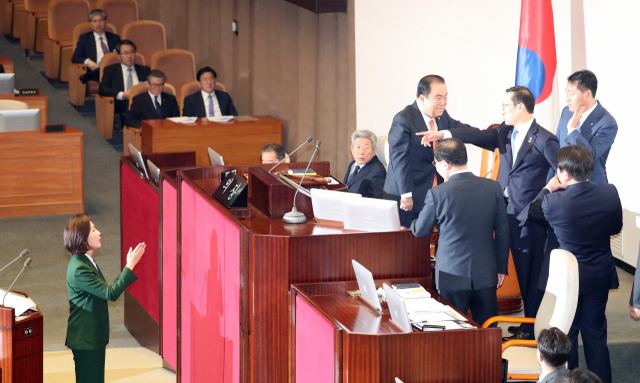 상황이 진정된 후 연설을 이어간 나 원내대표가 정부의 대북정책을 비판하는 대목에서 문 대통령을 향해 "김정은 수석 대변인이라는 낯뜨거운 이야기를 듣지 않도록 해달라"고 하자 여야의 갈등이 폭발했다. 민주당 의원들은 나 원내대표의 발언에 항의하며 집단 퇴장할 기세를 보였고, 홍영표 민주당 원내대표는 아예 단상으로 나가 나 원내대표의 발언을 제지했다. 이에 한국당 지도부도 단상에 나와 국회의장에게 이 같은 발언 방해를 항의했고 장시간 연설이 중단됐다. 여야 지도부는 몸싸움까지 하는 등 낯뜨거운 행태를 보이기도 했다.