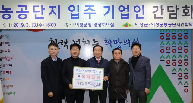 남재황 의성군 농공단지연합회장과 입주업체 대표자들은 13일 김주수 의성군 인재육성재단 이사장(의성군수)에게 장학금 500만원을 기탁했다.