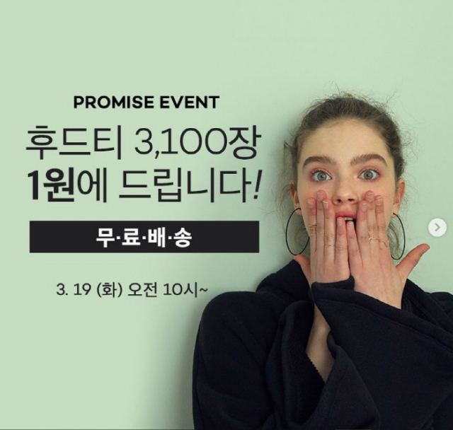 안다르는 5만1천원의 후드티 3천100장을 1원에 무료배송으로 판매한다고 19일 밝혔다.