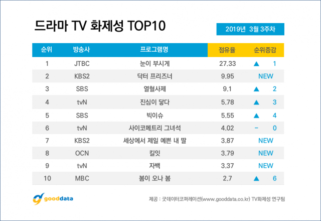굿데이터코퍼레이션이 지난 26일 발표한 TV화제성 드라마 부문에서 JTBC 월화드라마 '눈이 부시게(점유율 27.33%)'가 방영 이후 처음으로 1위에 오르며 종영했다. '눈이 부시게'는 3월 3주차에 18년부터 현재까지 방영한 월화드라마의 주간 화제성 점수 중 최고점을 기록했다. 웰메이드 드라마라는 극찬이 쏟아졌으며, 주연 김혜자, 한지민, 남주혁은 각 출연자 화제성 1위, 2위, 5위에 이름을 올렸다.
