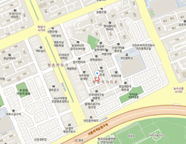 평촌먹거리촌 내에 있다. 평촌학원가 동편이다. 귀인중학교 기준으로는 서편.