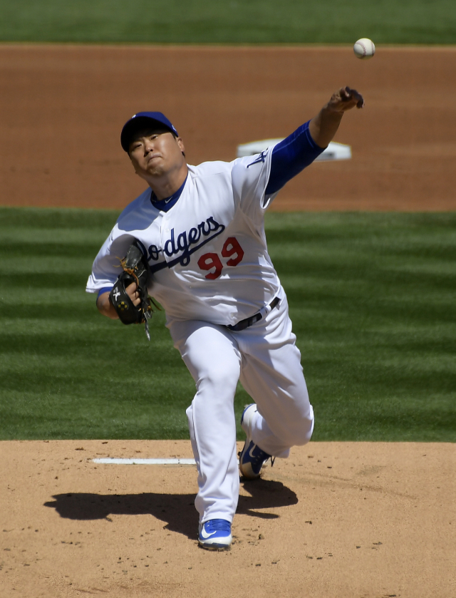 류현진(로스앤젤레스 다저스)이 28일(현지시간) 미국 캘리포니아주 로스앤젤레스 다저스타디움에서 열린 '2019 메이저리그(MLB)' 애리조나 다이아몬드백스와 개막전에서 2회 역투하고 있다. 류현진은 이날 6이닝 동안 삼진 8개를 솎아내며 1실점 호투를 펼쳐 박찬호에 이어 18년 만에 한국인 빅리거로는 두 번째로 미국프로야구 메이저리그 개막전에서 승리를 안았다. 연합뉴스