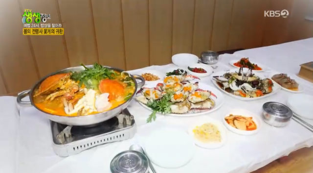 '꽃게 한 상' 메뉴가 15일 KBS2 2TV 생생정보에 소개된다. 꽃게탕, 꽃게찜, 그리고 간장게장으로 구성된 메뉴.