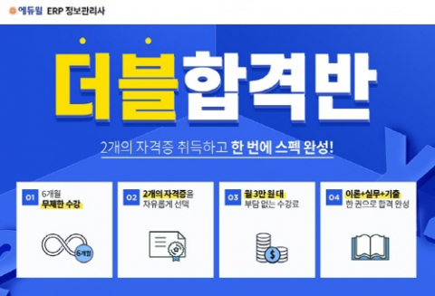 이와 관련 종합교육기업 ㈜에듀윌은 ERP 정보관리사 8개 자격증 중 희망하는 자격증 2개를 선택해 수강할 수 있는 '더블합격반'을 선보이고 수강생을 모집중이다.