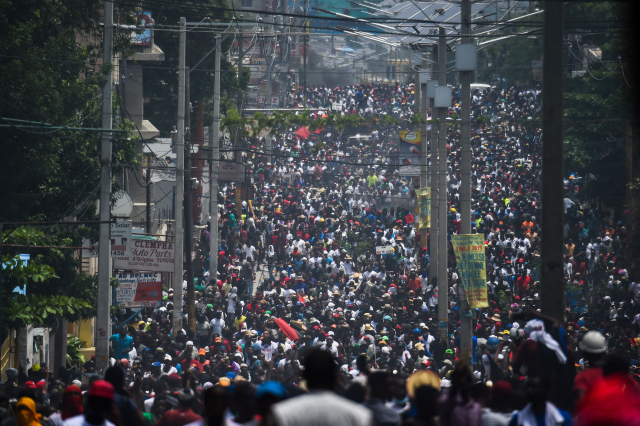 아이티 시민들이 9일(현지시간) 수도 포르토프랭스에서 개발원조자금 횡령의 중심으로 지목받고 있는 조브넬 모이즈 대통령의 퇴진을 요구하며 대규모 반정부 시위를 벌이고 있다. 연합뉴스