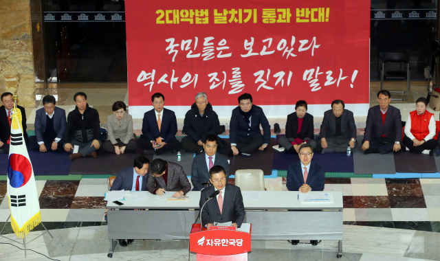 자유한국당 황교안 대표가 15일 국회 로텐더홀 농성장에서 열린 '문 정권 국정농단 3대 게이트' 관련 기자회견'에서 발언하고 있다. 연합뉴스