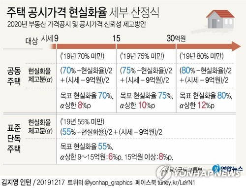 17일 국토교통부가 발표한 '2020년 부동산 가격공시 및 공시가격 신뢰성 제고방안'에 따르면 내년도 공동주택 공시가 현실화율(시세 대비 공시가 비율)은 68.1%에서 최대 80%로 높아진다. 시세 9억~15억원인 공동주택은 70%, 15억~30억원은 75%, 30억원 이상은 80% 등이다. 단, 공시가격이 급등하지 않도록 시세 9억~15억원은 최대 8%p, 15억~30억원은 최대 10%p로 상한을 두기로 했다.