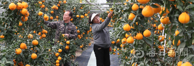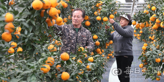 경북 경산에서 제주 특산물인 레드향, 천혜향, 한라봉 등 만감류 과일이 시설하우스로 재배돼 가지마다 주렁주렁 열렸다. 29일 박치성(63·경산 만감류 작목회장)·이분선(61)씨 부부가 와촌면 대광농원에서 레드향을 수확하고 있다. 박치성 작목회장은 " 2017년부터 3년째 수확 중인 경산 만감류는 제주 지역보다 일조량이 좋아 당도가 높다"고 말했다.