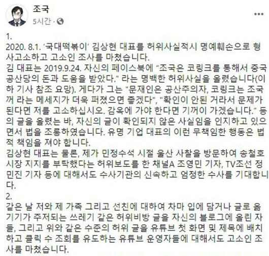 조국 전 법무부 장관이 2일 자신에 대한 허위사실을 퍼뜨렸다며 '국대떡볶이' 김상현 대표를 형사고소했다.