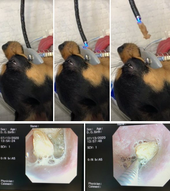 내시경 검사를 통해 까미의 식도를 관찰했더니, 이물질이 개껌으로 추정됐다. 이에 내시경 포셉을 이용해 ⅔ 이상은 견출해 구강으로 제거하고 나머지는 위로 내려보냈다. 개껌 제거 후 식도 점막을 다시 한번 세척하고 검사했다. 다행히 유착된 점막에서 소량의 출혈은 발생했지만 심각한 감염증은 관찰되지 않았다. 이에 까미는 다음날 퇴원했다. 보호자에게는 5일 정도 식도를 자극하지 않도록 부드러운 유동식을 소량씩 나눠 급여시킬 것 을 당부했다.
