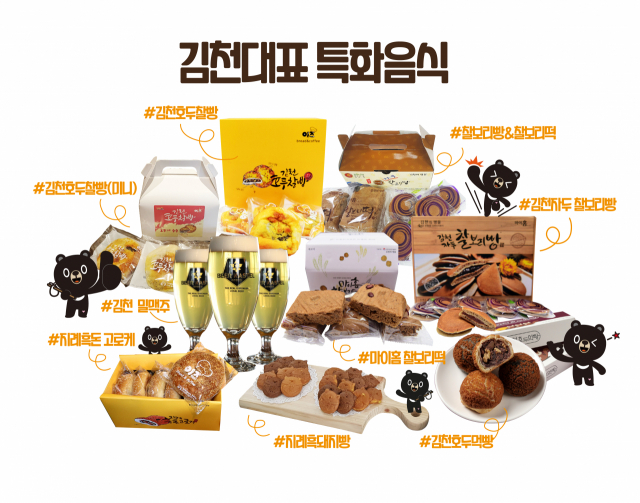 '지례흑돈 고로케', '김천호두 찰빵', '김천자두 찰보리빵', '마이홈 찰보리떡', '김천 밀맥주', '호두먹빵', '지례흑돼지빵'.