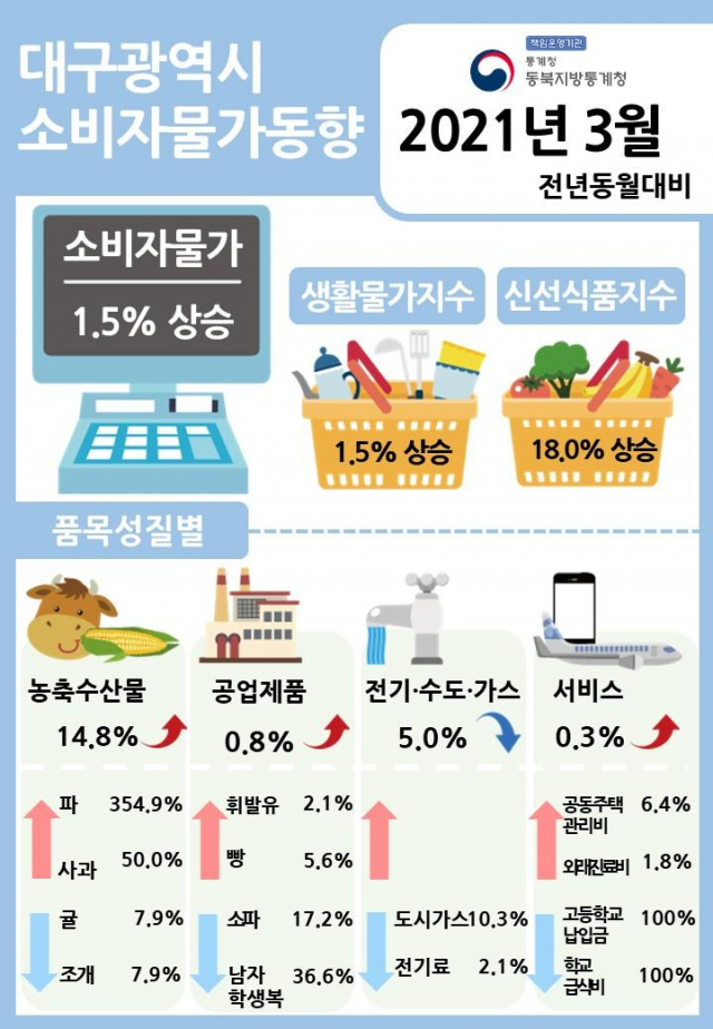 지난달 전국 소비자물가가 코로나19 사태 이후 가장 높은 상승률을 기록한 가운데 대구·경북 소비자물가도 일제히 상승했다. 특히 파, 사과 등 농축수산물 가격이 크게 오른 것으로 나타났다.