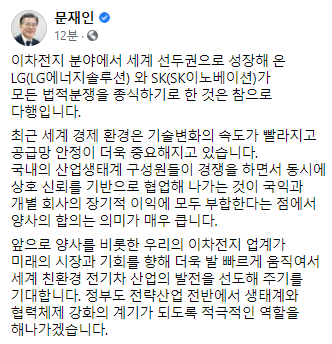 문재인 대통령은 12일 자신의 페이스북에서 "이차전지 분야에서 세계 선두권으로 성장해 온 LG(LG에너지솔루션) 와 SK(SK이노베이션)가 모든 법적분쟁을 종식하기로 한 것은 참으로 다행"이라고 말했다.