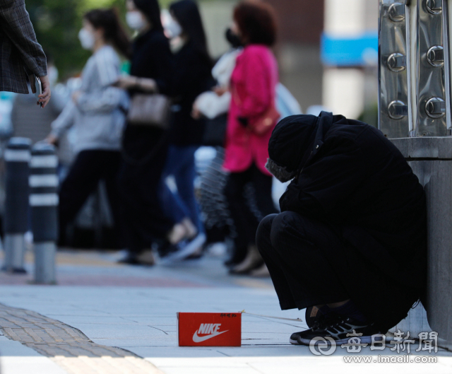 14일 대구 중구 국채보상로 인도에서 한 노숙인이 꽃샘추위를 피해 몸을 웅크린 채 앉아 온정의 손길을 기다리고 있다. 15일 아침 최저기온은 대구 5℃, 경북 봉화 -2도로 예상돼 4월들어 가장 추운날씨를 보일 것으로 대구기상청은 예보했다. 우태욱 기자 woo@imaeil.com