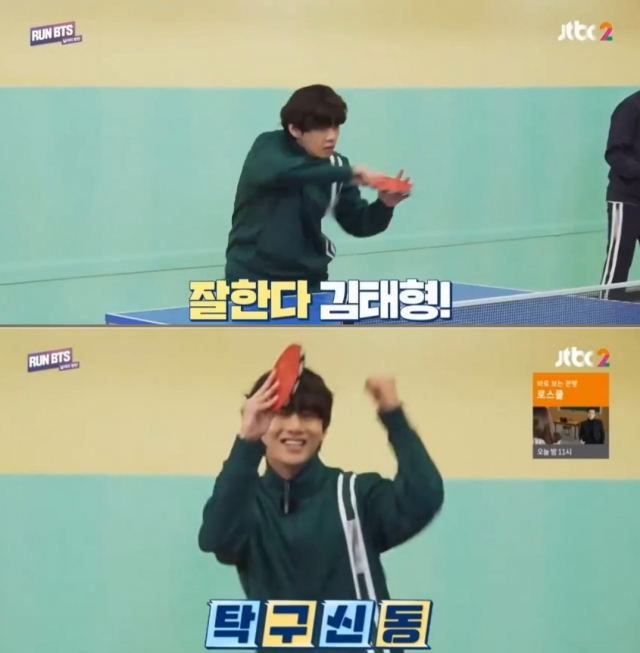 탁구채 잡는 방법부터 기본 랠리를 배운 뷔는 처음엔 긴장한 듯 공을 세게 쳤으나 타고난 운동감각과 빠른 습득력으로 곧 일취월장한 실력을 발휘했다.