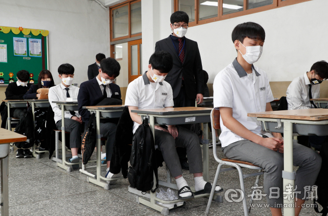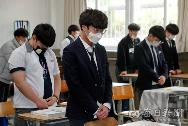 세월호 참사 7주기인 16일 대구지역 각급 학교에서 희생자들을 기리는 추모 행사가 진행된 가운데 수성구 만촌동 영남공고 3학년 학생들이 세월호 참사를 기억하고 추모하기 위해 1분간 추모 묵념을 하고 있다. 우태욱 기자 woo@imaeil.com