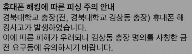 경북대는 이날 오후 3시 55분쯤 학생 등 경북대 구성원들에게 공지를 통해 "경북대학교 총장(전, 경북대학교 김상동 총장) 휴대폰 해킹 사고가 발생했다. 이에 따른 피해가 우려되니 김상동 총장 명의를 사칭한 금전 요구 등에 유의하시기 바란다"고 알렸다.