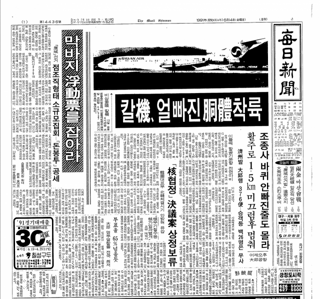 여객기에는 120여 명의 승객이 타고 있었다. 하마터면 대형 참사가 날 뻔했지만 하늘이 보우하사 부상자만 일부 발생했다. 기체도 치명적 파손을 입지 않았다. 당시 매일신문이 '얼빠진 동체착륙'이라는 1면 톱 기사를 실은 기억이 생생하다. 대한민국 항공 역사에 기록될 만한 어처구니없는 사고였다.