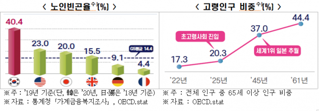 한국의 65세 이상 고령인구 비중은 올해 기준 17.3%로 G5보다 낮은 수준이지만, 2025년에는 20.3%로 미국(18.9%)을 제치고 초고령사회에 진입할 것으로 예상됐다. 2045년에는 37.0%로 세계 1위인 일본(36.8%)도 추월할 것으로 전망됐다.