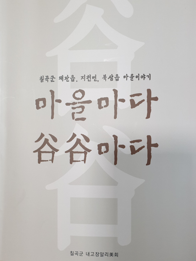 '마을마다 곡곡마다'란 이름의 이 책은 왜관 매원마을과 북삼 어로리, 지천 달서리 및 황학리 옷갓마을 주변의 숨어있는 문화를 조사해 수록했다.
