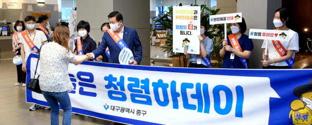 대구 중구(구청장 류규하)는 지난 4일 구청 1층 로비에서 중구 전직원의 청렴 의식을 고취하기 위해 출근하는 직원들에게 청렴 부채와 이해충돌방지법 홍보 리플릿을 나눠 주고,간부공무원이 솔선수범하는 '청렴하데이 캠페인'을 실시했다.