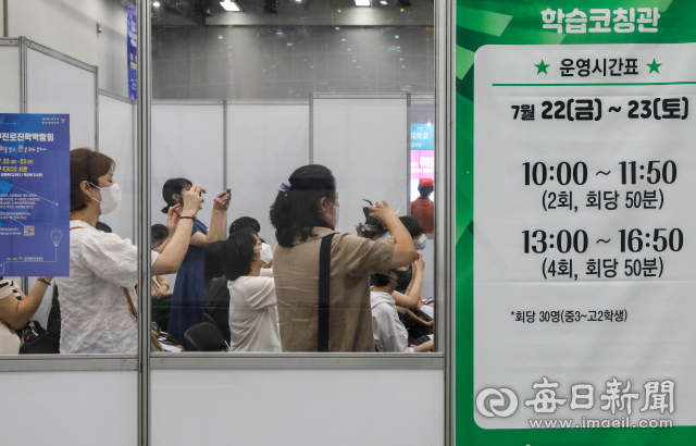 22일 대구 엑스코에서 대구시교육청 주최로 열린 대구진학진로박람회에서 학부모들이 학습코칭 강의를 듣고 있다. 대학별 상담관과 멘토멘티관, 수시상담관, 학교생활 디자인관 등으로 구성된 이번 박람회에서는 전국 60여개 대학 관계자와 진학 전문가들이 23일까지 중고등학생과 졸업생, 학부모에게 최신 대입정보를 제공하고 진학 상담을 한다. 우태욱 기자 woo@imaeil.com