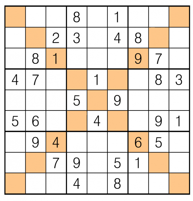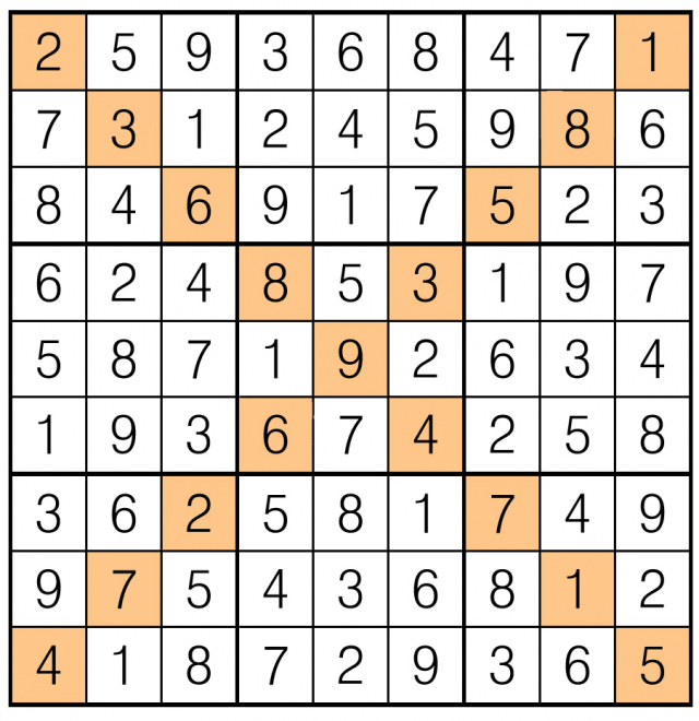 아래의 정사각형 안에 1~9까지의 숫자가 나열되어 있습니다.여기에 1~9까지의 숫자를 사용하여 가로,세로,대각선 방향은 물론 작은 정사각형 안에도 1~9까지의 숫자가 골고루 들어 가도록 하여 보세요.