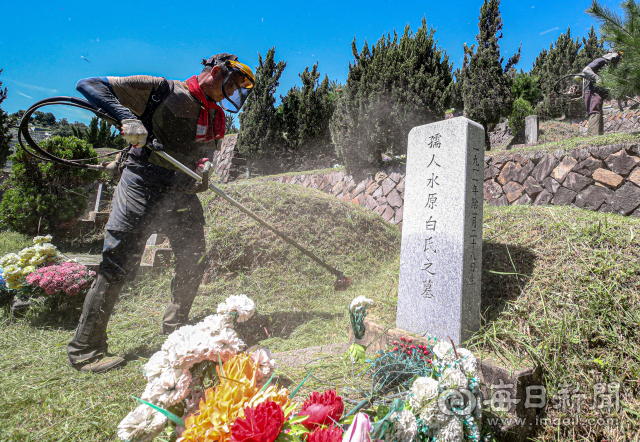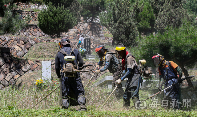 추석을 보름 앞둔 28일 오전 경북 칠곡군 현대공원에서 공원 관계자들이 묘소 벌초를 하고 있다. 안성완 기자 asw0727@imaeil.com