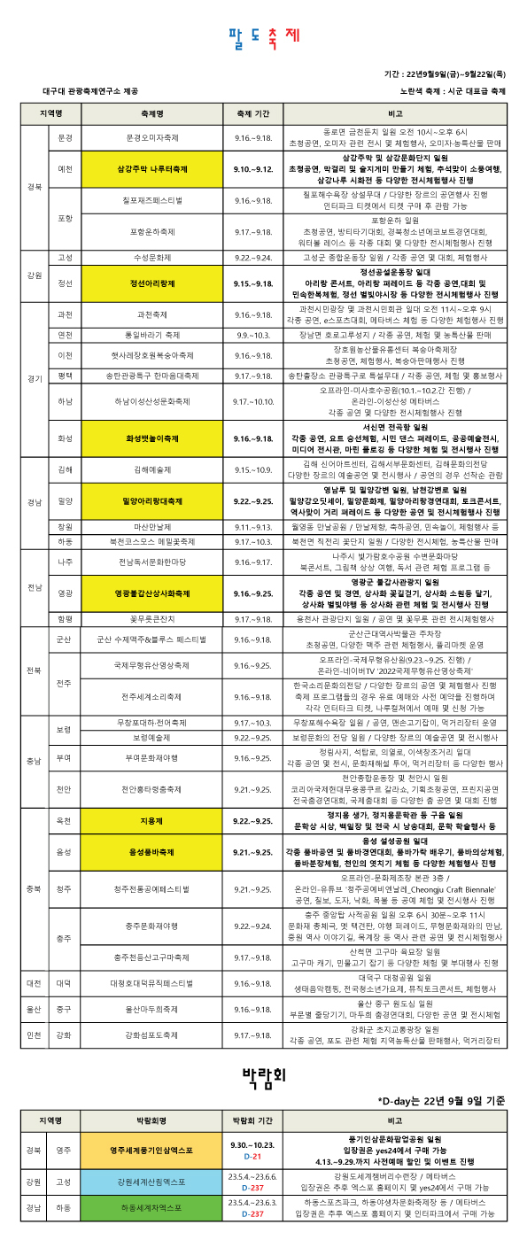 한편 한국지방신문협회 회원사들은 대한민국의 지방축제활성화를 위해 각 지자체 등의 협조를 받아 매주 진행되는 중요 축제 관련 기사게재, 금주에 진행되는 전국 모든 축제일정을 요약한 '팔도축제'를 게재해 지방 축제의 홍보와 더불어 직접적인 축제 관광객 모객을 통한 축제 활성화에 노력하고자 한다.