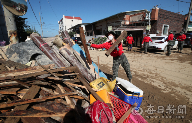 7일 오전 '힌남노'로 가장 큰 타격을 받은 경북 포항의 한 마을에서 해병대 장병들이 수해 복구 작업을 하고 있다. 안성완 기자 asw0727@imaeil.com