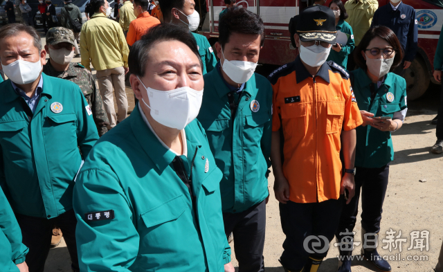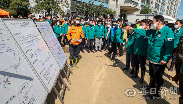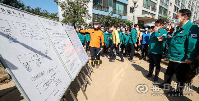7일 오후 경북 포항을 방문한 윤석열 대통령이 제11호 태풍 '힌남노'로 7명의 희생자가 발생한 한 아파트에서 피해 현황을 보고 받고 있다. 안성완 기자 asw0727@imaeil.com