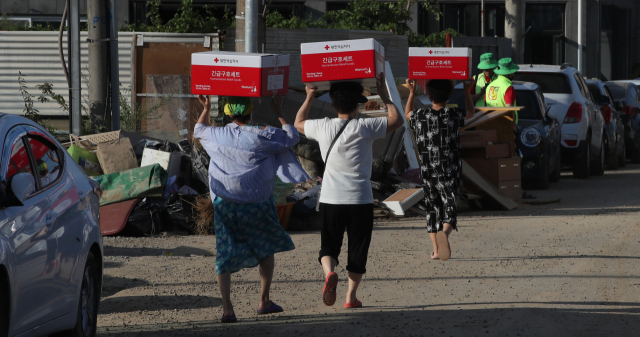 [포토뉴스] 구호물품 들고 이동하는 이재민들