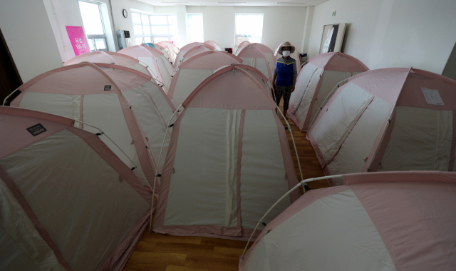 7일 오후 경북 포항시 남구 대송면 다목적 복지회관에 마련된 임시 대피소에서 한 이재민이 텐트를 살펴보고 있다. 김영진 기자 kyjmaeil@imaeil.com