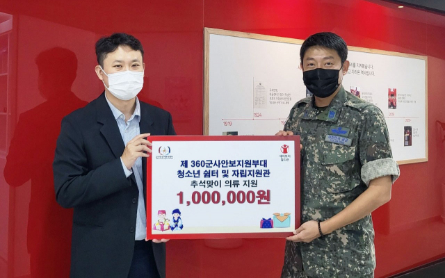 제360군사안보지원부대는 지난 8일 대구시내 청소년 쉼터 및 자립지원관 아동대상 추석맞이 의류지원 기금을 세이브더칠드런(지역본부장 노성훈)전달했다고 13일 밝혔다. 부대 관계지는 "부대원들이 함께 모은 기금으로 아동들에게 필요한 의류를 제공할 수 있어 기쁘다"고 말했다.