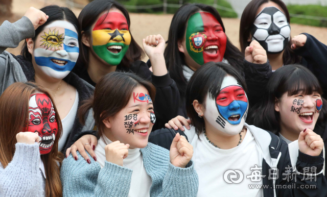'2022 카타르 월드컵' 한국 대표팀의 첫 경기를 하루 앞둔 23일 대구 수성구 수성대학교에서 뷰티스타일리스트과 학생들이 한국과 조별 예선전을 펼칠 우루과이, 가나, 포르투갈 국기와 붉은 악마 등으로 분장한 뒤 태극전사들의 승리를 기원하고 있다.