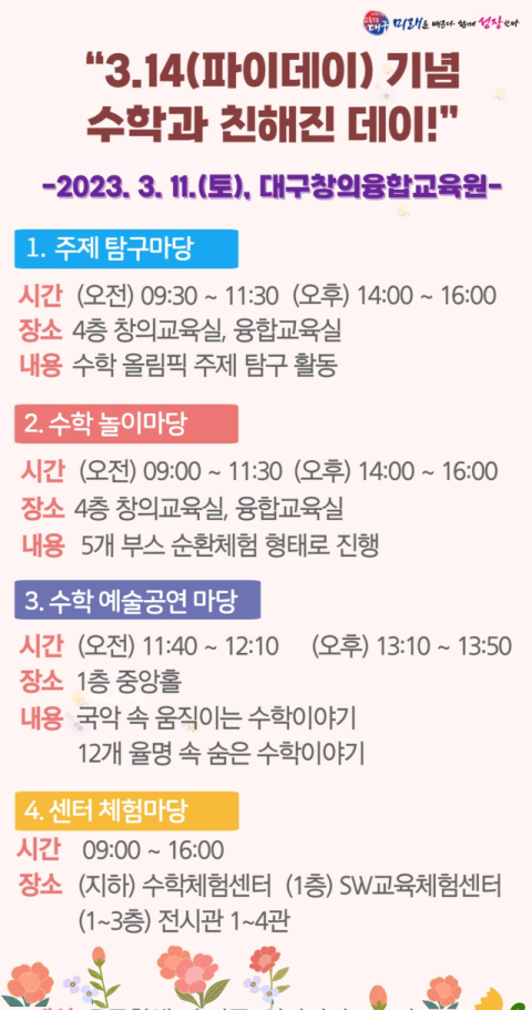 대구창의융합교육원은 오는 11일부터 내달 28일까지 초등학생 및 가족, 일반시민을 대상으로 π-day(파이데이) 기념 '수학과 친해진 데이' 행사를 다채롭게 운영한다.