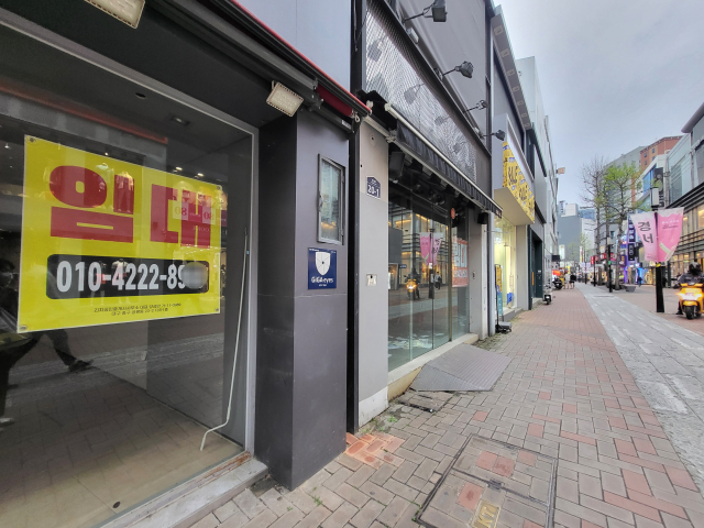 9일 오후 5시쯤 찾은 대구 중구 동성로. 통신골목 시계탑에서 대구백화점 본점 건물로 향하는 길 초입부터 '임대' 현수막이 등장했다. 이 250여m 거리에서 1층에 임대 현수막을 붙여둔 건물은 9곳. 대백 본점~중앙파출소 삼거리 300여m 구간에도 1층이 공실 상태인 건물이 9곳에 달했다. 특히 대백 본점 인근에 나란히 붙은 7개 상점은 모두 임차인을 구하는 상황이었다.