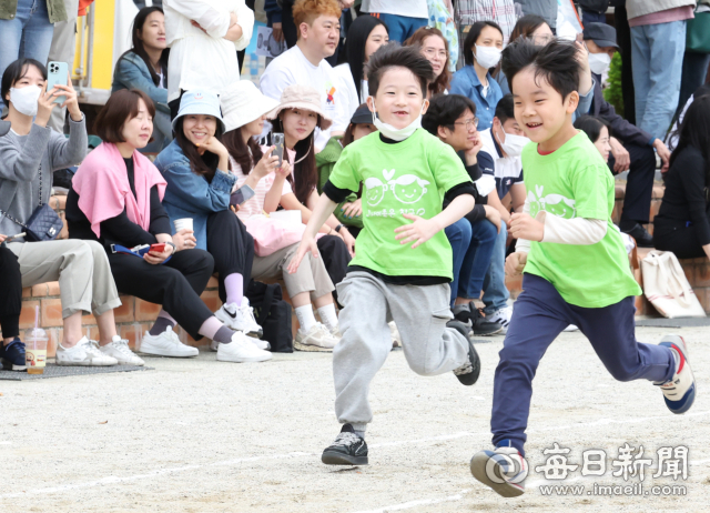 코로나19 여파로 중단됐던 학교 운동회가 4년 만에 열렸다. 어린이날을 하루 앞둔 4일 오전 대구 수성구 들안길초등학교 운동장에서 열린 '2023학년도 들락날락 놀이한마당 운동회'에 참가한 어린이들이 개인 달리기를 하고 있다. 안성완 기자 asw0727@imaeil.com