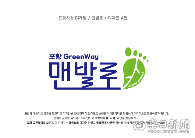 맨발로는 생활권과 가까운 도시숲, 수변공간에 조성된 맨발 걷기가 가능한 포항의 산책로를 의미한다. '맨발로 BI'는 모든 길이 포항 그린웨이로 이어진다는 기본 모티브에 '길+사람+자연'을 형상화해 디자인했다.
