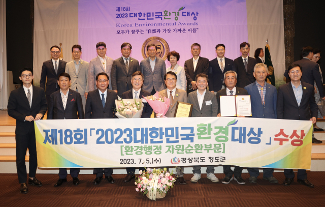 경북 청도군이 5일 환경부, 교육부, 농림축산식품부 등 7개 중앙부처가 후원하는 '제18회 대한민국환경대상' 환경행정 분야 자원순환 부문 대상을 수상했다.
