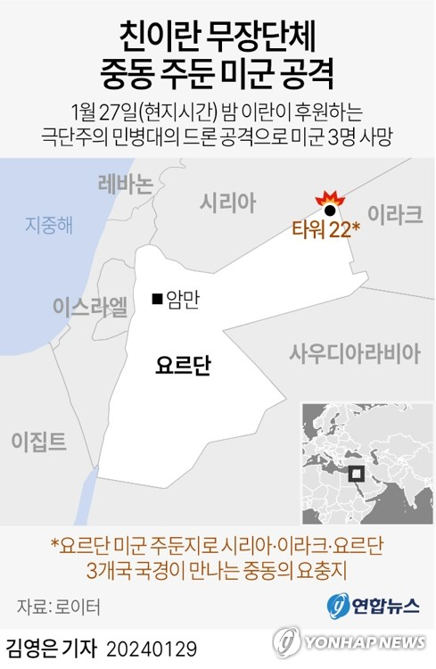 한편, 주유엔 이란 대표부는 이날 성명을 내고 이란은 미군 3명의 목숨을 앗아간 요르단 미군기지 공격과 무관하다고 주장했다. 이란의 지원을 받는 이라크 무장조직 '이슬라믹 레지스턴스'(Islamic Resistance)는 이날 요르단과 시리아 국경 지대의 미군기지 4곳을 동시다발적으로 공격했다고 밝혔다.