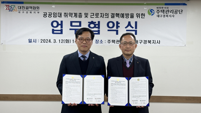 주택관리공단 대구경북지사는 지난 12일 대한결핵협회 대구경북지부와 업무 협약을 체결했다고 13일 밝혔다. 이들은 공공임대주택에 있는 취약계층 및 근로자들의 결핵 예방을 위해 힘쓸 예정이다.